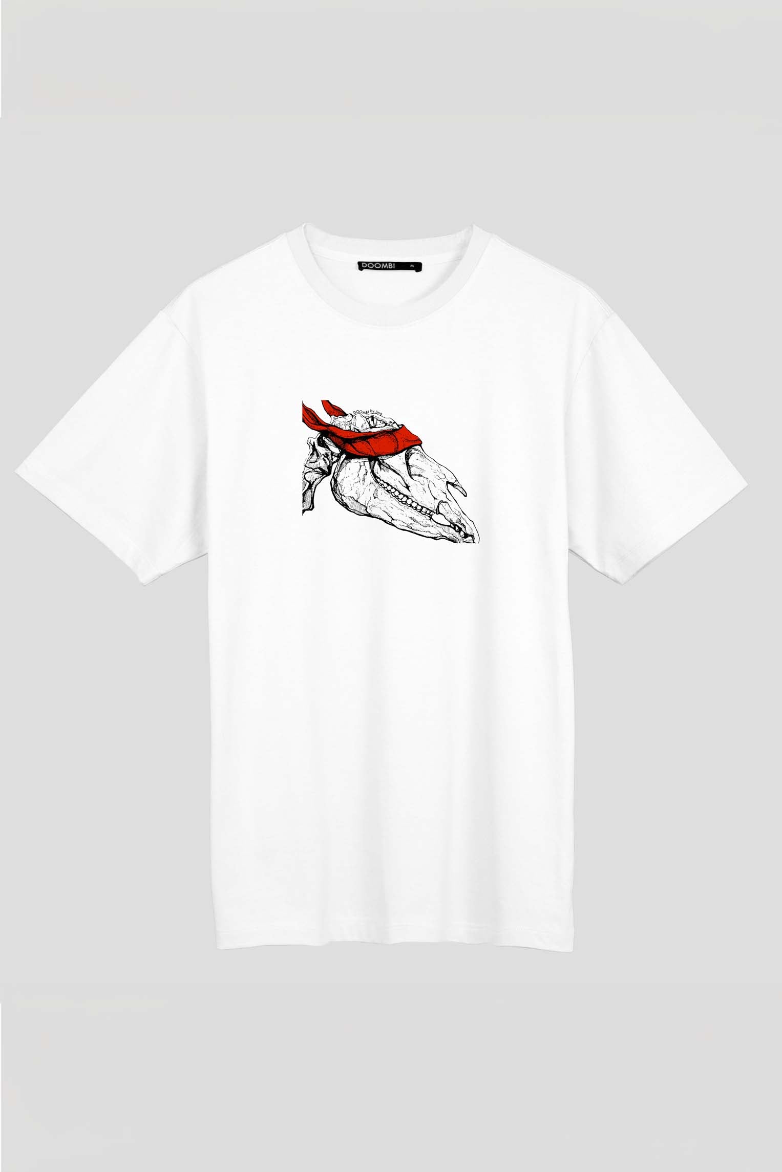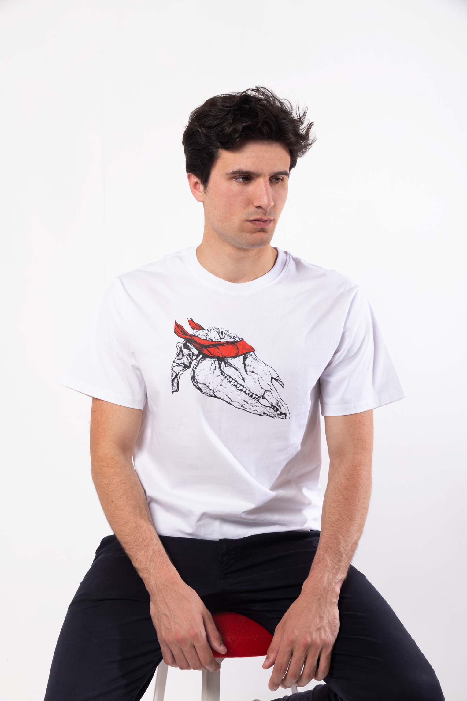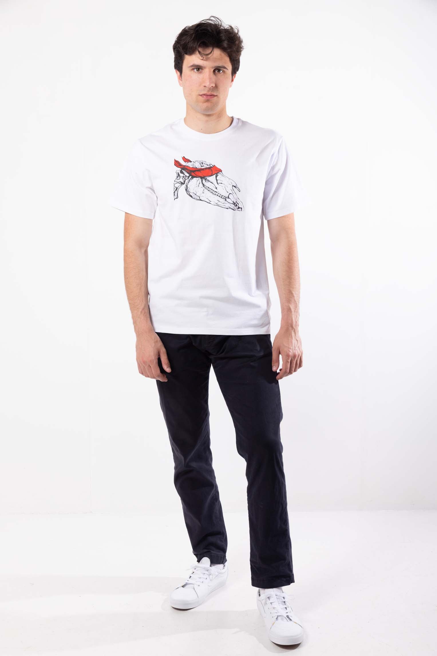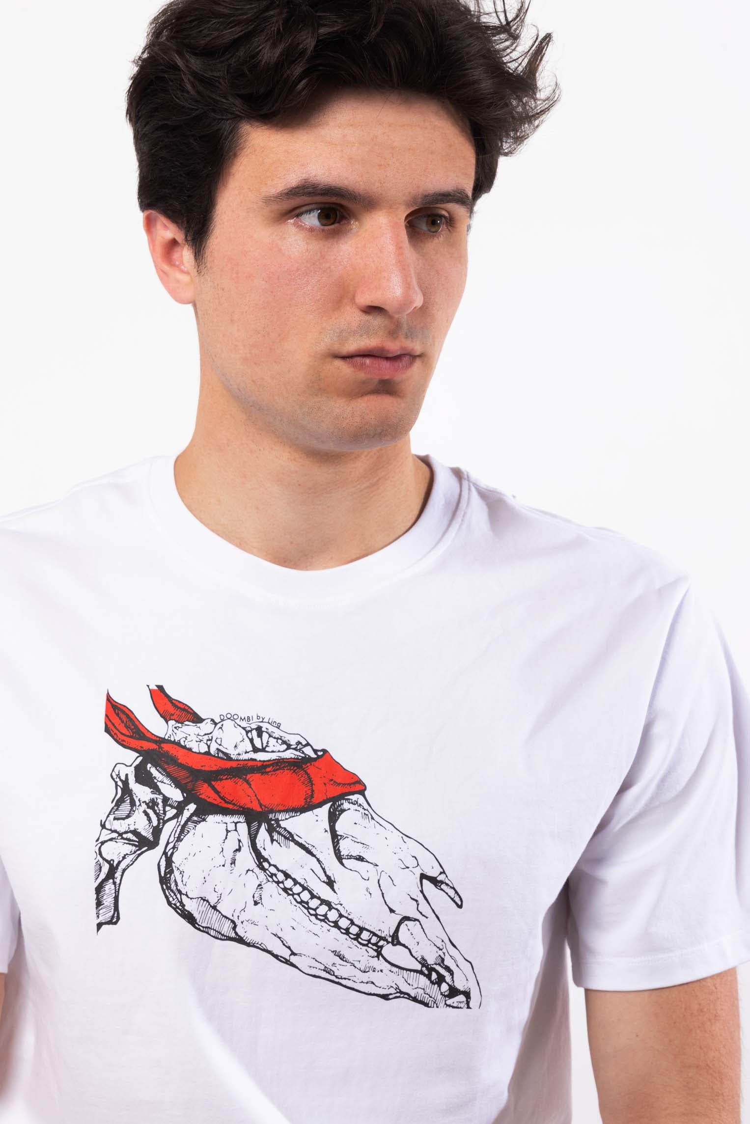Plongez dans l'univers du style intemporel et embrassez le charme de l'inconnu avec notre t-shirt pour homme mettant en vedette un gros plan du squelette d'un dinosaure, agrémenté d'un tissu captivant recouvrant ses yeux. Fabriqué à partir de tissu de première qualité, ce t-shirt garantit un confort et une durabilité inégalés.